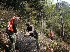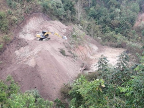 [早速、教会員全員で掘削し、山にグランドの面積を広げている様子]