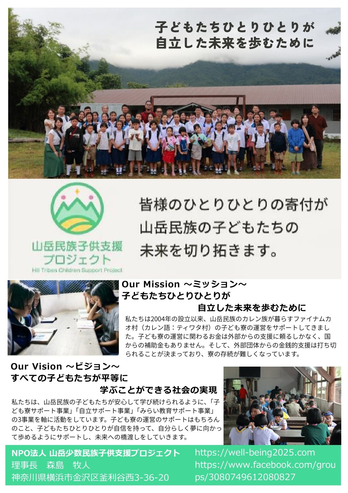 いま子どもの未来に関わる教育を受ける環境が無くなってきている。マイノリティが故にタイのセーフティネットも受けられず、外部の支援も受けられなくなり、都市部との格差は広がるばかり。これらのこの課題を解決したい思いで、この11月にミッション・ビジョンを改め、自立した寮の運営を行えるよう子ども寮サポート事業・自立サポート事業・みらい教育サポート事業の3つの事業を柱に活動しています。